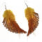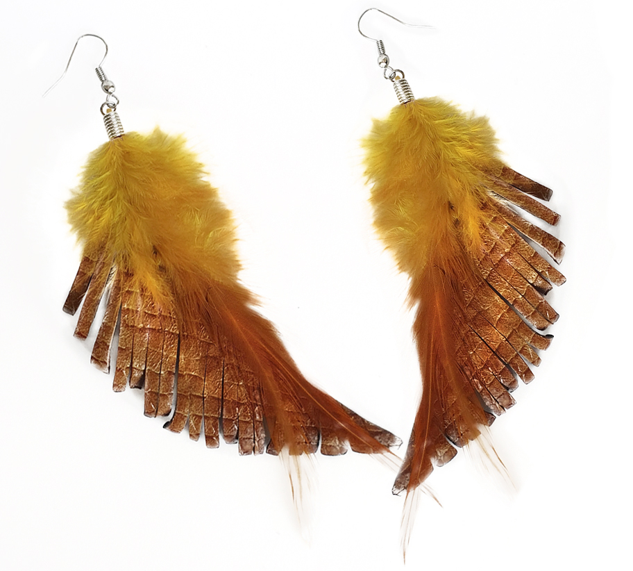 A függő fülbevaló egy egzotikus mintás bőrből és egy mézsárga marabu tollből áll.