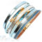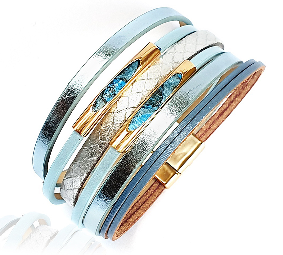 Elegáns, dekoratív darab! A karkötő 6 sávos világoskék zsinór egyveleggel pompázik. Az arany színü fémköztesben kékfestett pyton bőr díszeleg. A karkötő vége arany színü mágneszárral csatolódik. Karkötő mérete: 3×18,5 cm. A karkötőt ajándék dísztasakban szállítom!