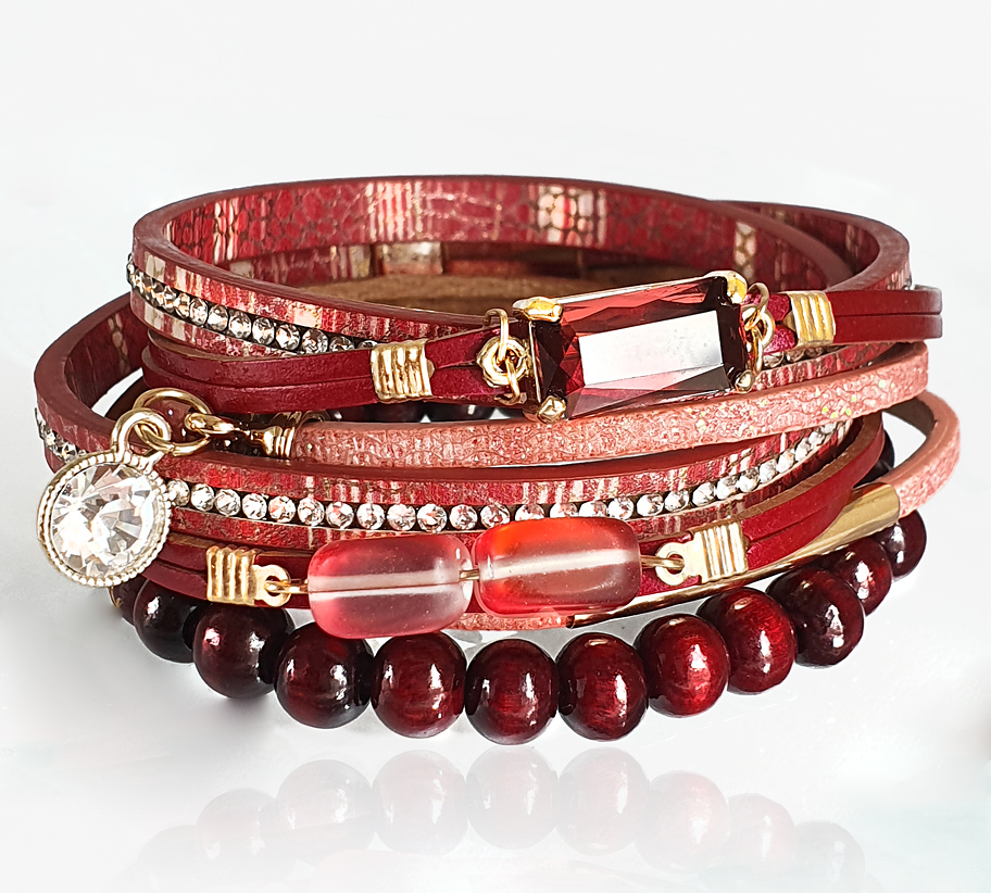 Elegáns, dekoratív darab! A karkötő 2 darabos! A karkötő 4 sávos különböző zsinór egyvelegével pompázik. A bordó és rózsaszín többzsinóros karkötő közepét fazettált üveggyöngy dísziti. A cirkonköves szál dekoratív külsőt ad a karkötőnek. A karkötő másik kiegészítője egy bordó színü 8mm-.es fagyöngy, így színükkel tökéletes párost alkotnak. Természetesen külön-külön is viselhetőek!