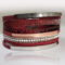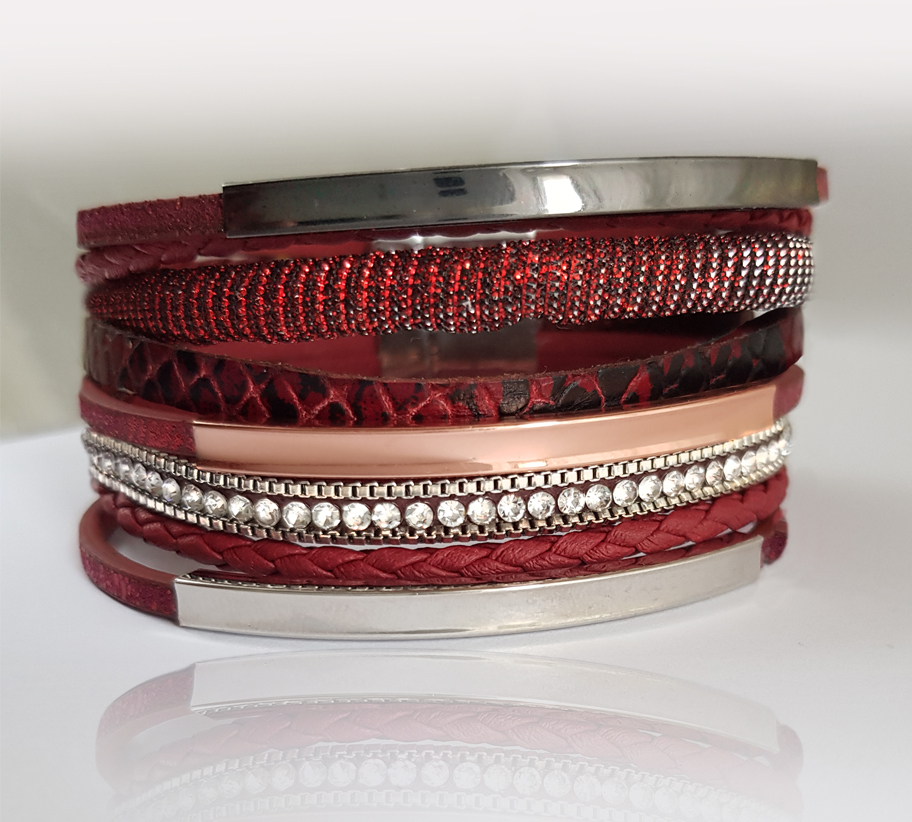A bordó többzsinóros karkötőt egzotikus bőr, hengerbőr, strasszos csík, valamint 3 színű nemesacél fémköztes díszíti.