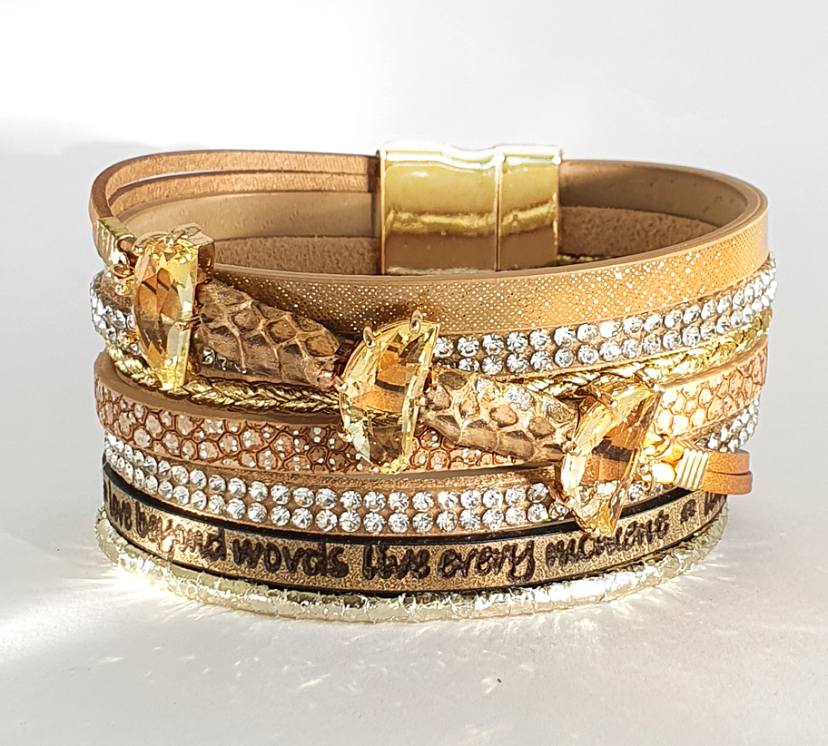 A karkötő 8 sávos különböző zsinór -drapp, óarany- arany- színeiben pompázik. Az óarany bőrszál átlósan helyezkedik három csiszolt gyöngy ,valamint eredeti kígyóbőr díszitéssel. A karkötő további érdekessége az alső bőrön lévő szeretet, szerelem felirat, mely örökké tart.