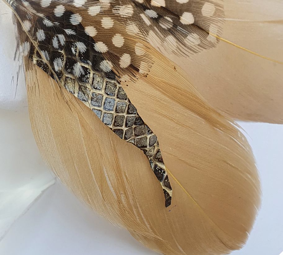 A drapp kígyóbőrrel díszitett maddártoll, egy különleges pöttyös gyöngytyúktoll és egy kígyóbőr diszitést kapott, mely igazán különlegessé teszi a fülbevalót.