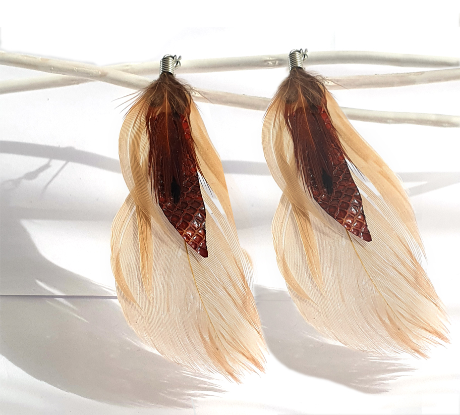 Pillekönnyü egzotikus, fülbe akasztós egyedi bőr fülbevaló.