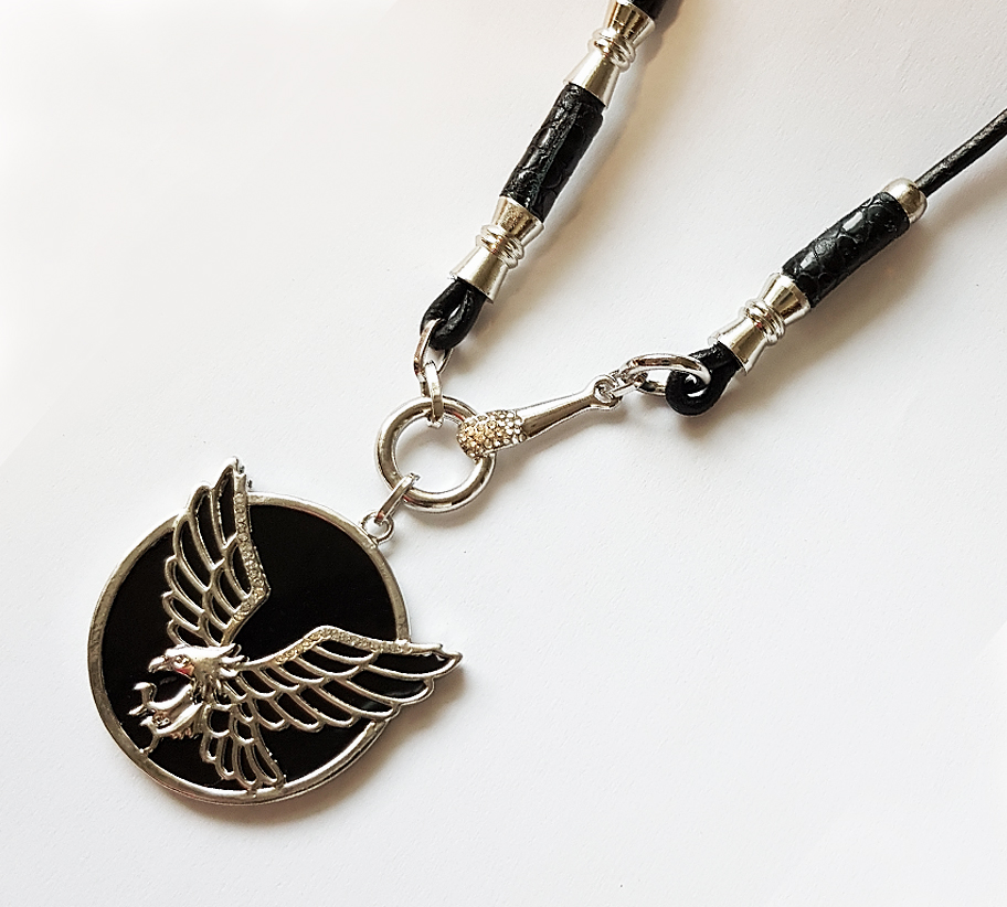 A bőr hengerelt zsinóron fémköztes és bőrgyöngy található. A medál ezüst színű sast ábrázol.,cirkonia kirakással.