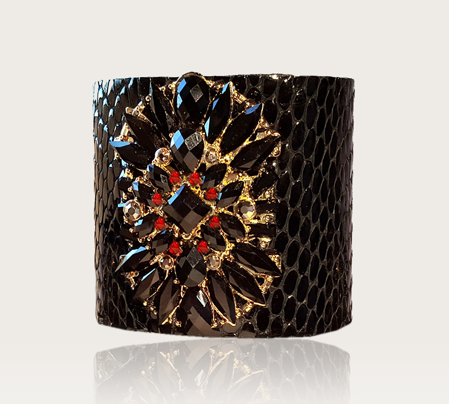 A fekete lakkbőr karkötő kígyómintával nyomott. A karkötő középső részén fekete köves díszítés található. Belső részén hasított bőr bélés van.A karkötő patenttal záródik 18 cm-en.