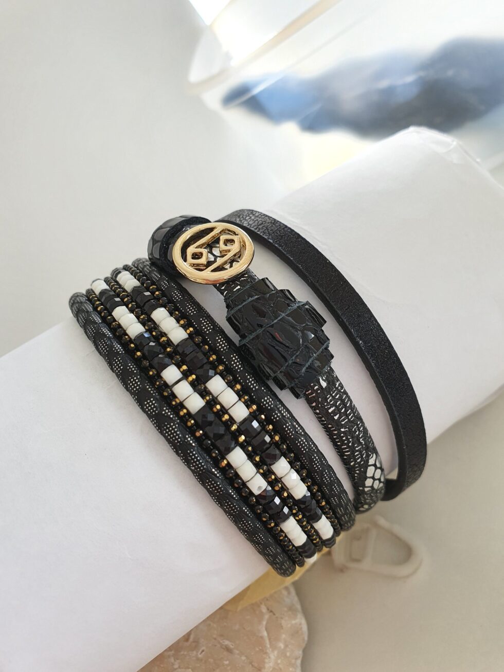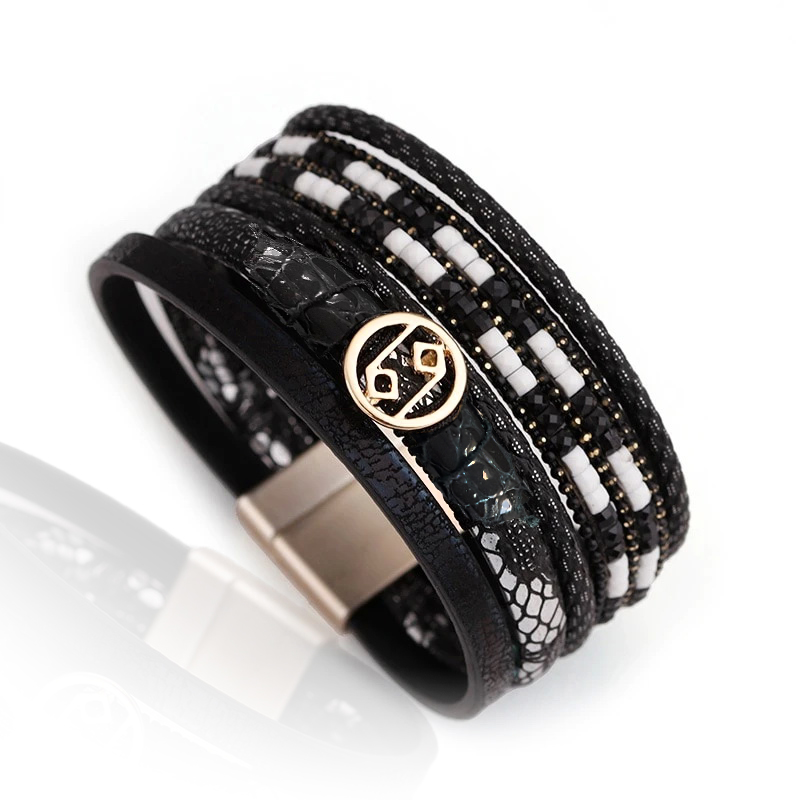 A fekete többzsinóros karkötőt egzotikus fekete lakk kígyómintás bőr, aprógyöngyös szál, valamint nemesacél fémköztes díszíti.