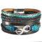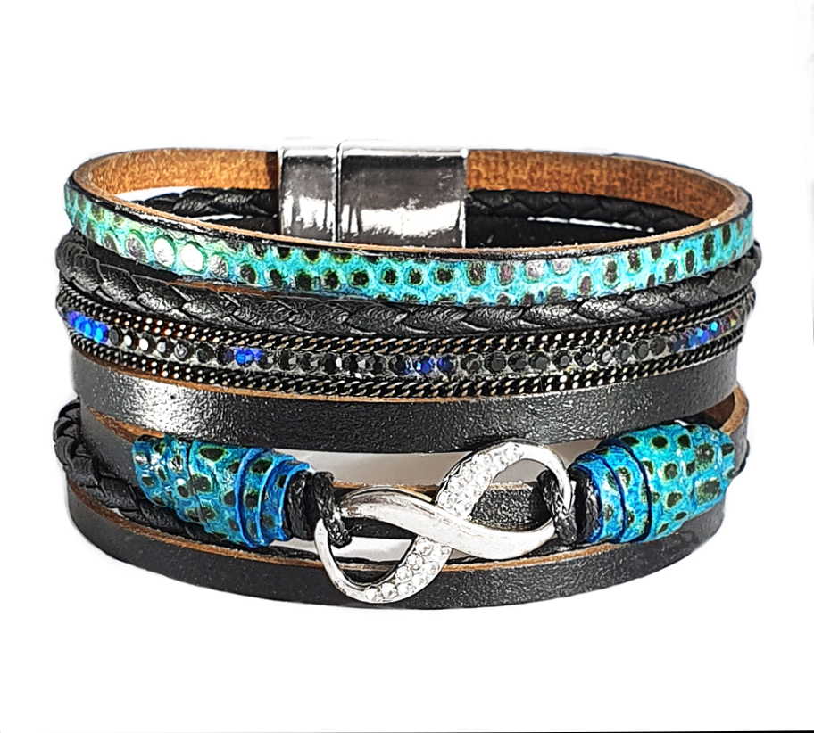 A karkötő végtelen charmjának két szélén zöld türkizzöld bőrgyöngy van.