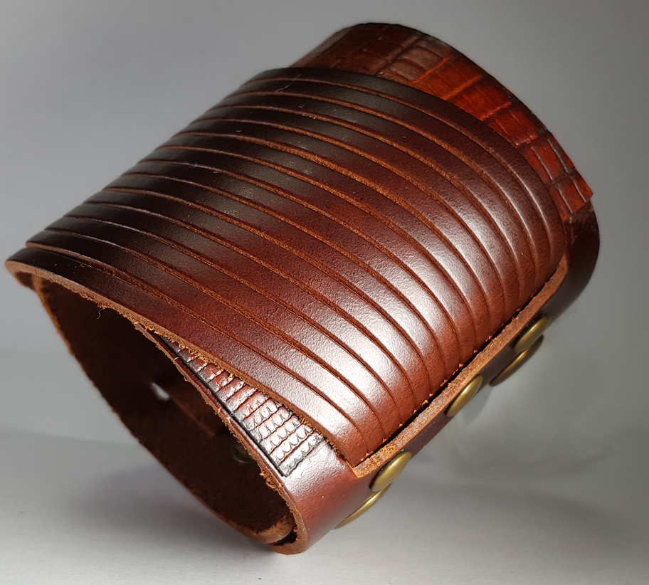 A bőr karkötő 6,58 cm x 22,5 cm Mutatós karkötő. Alapja krokodilbőr, melyet többsávos bőr díszít. Állítható patenttal záródik.
