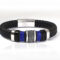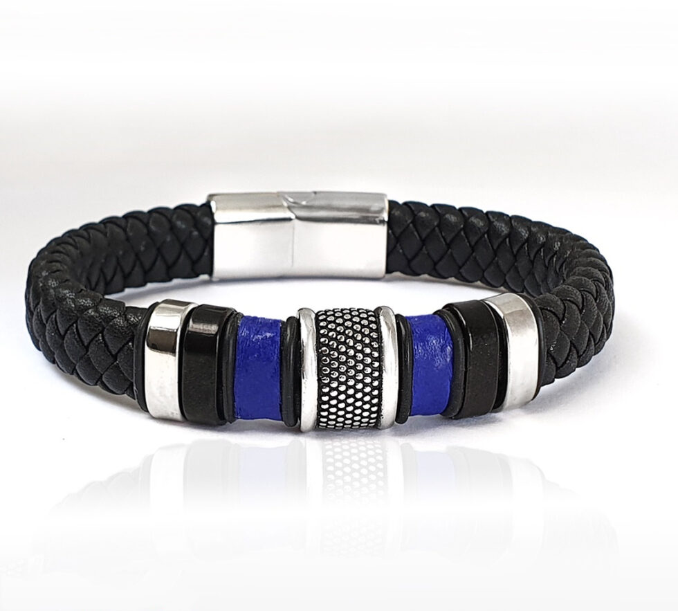 12 mm-es fonott bőrből készült ez az elegáns fekete karkötő. A karkötő közepén nemesacél köztes van,két oldalát kék juhmappa bőr díszíti. A kék és fekete szín tökéletes összhangot ad a karkötőnek. Elegáns, valamint sportos kiegészítője lehet ruhadarabodnak.