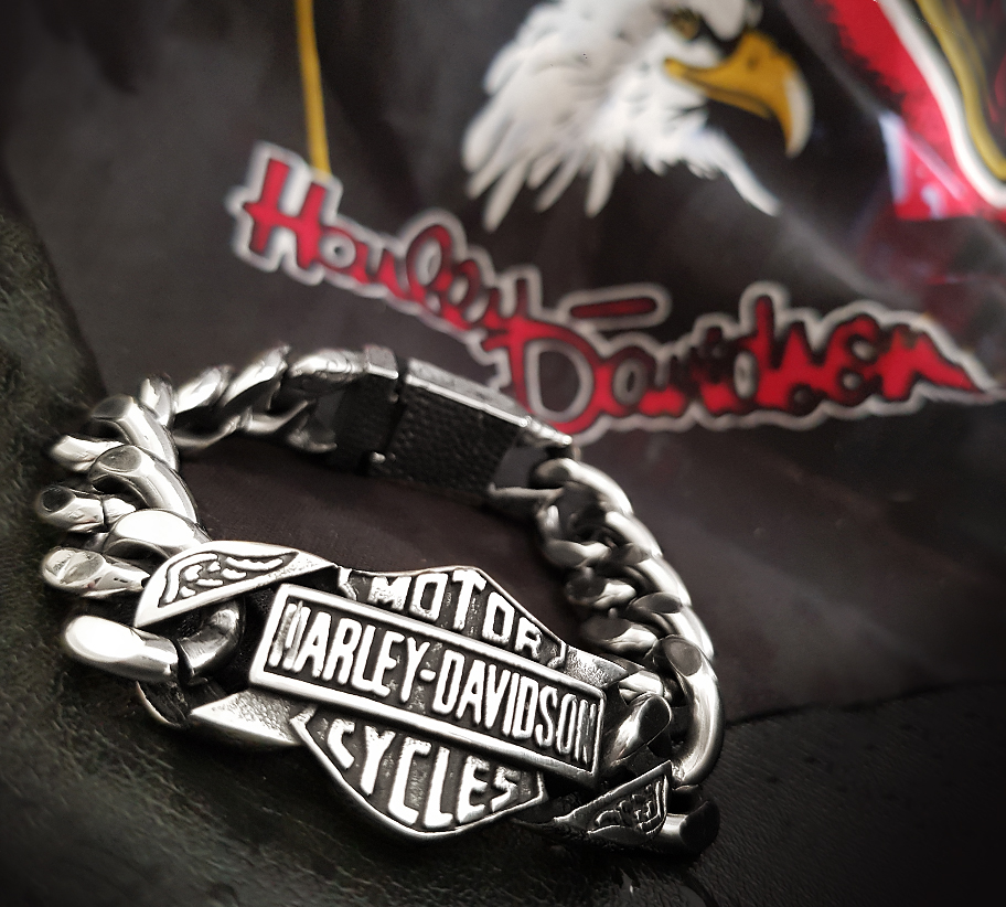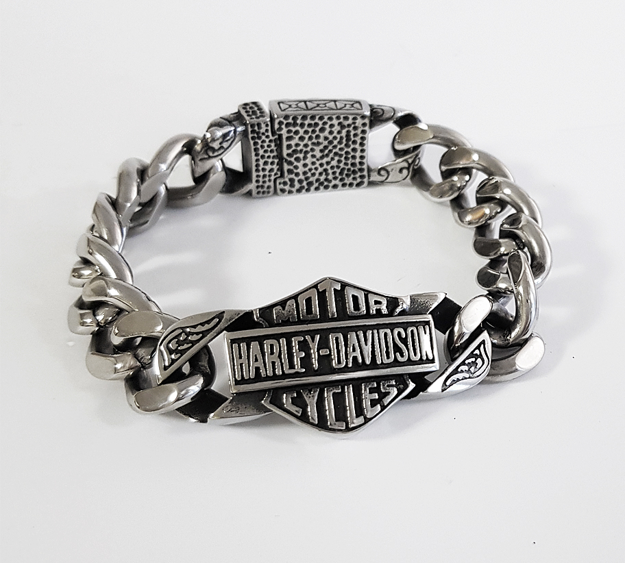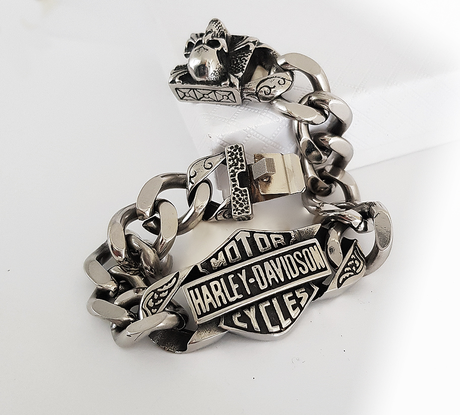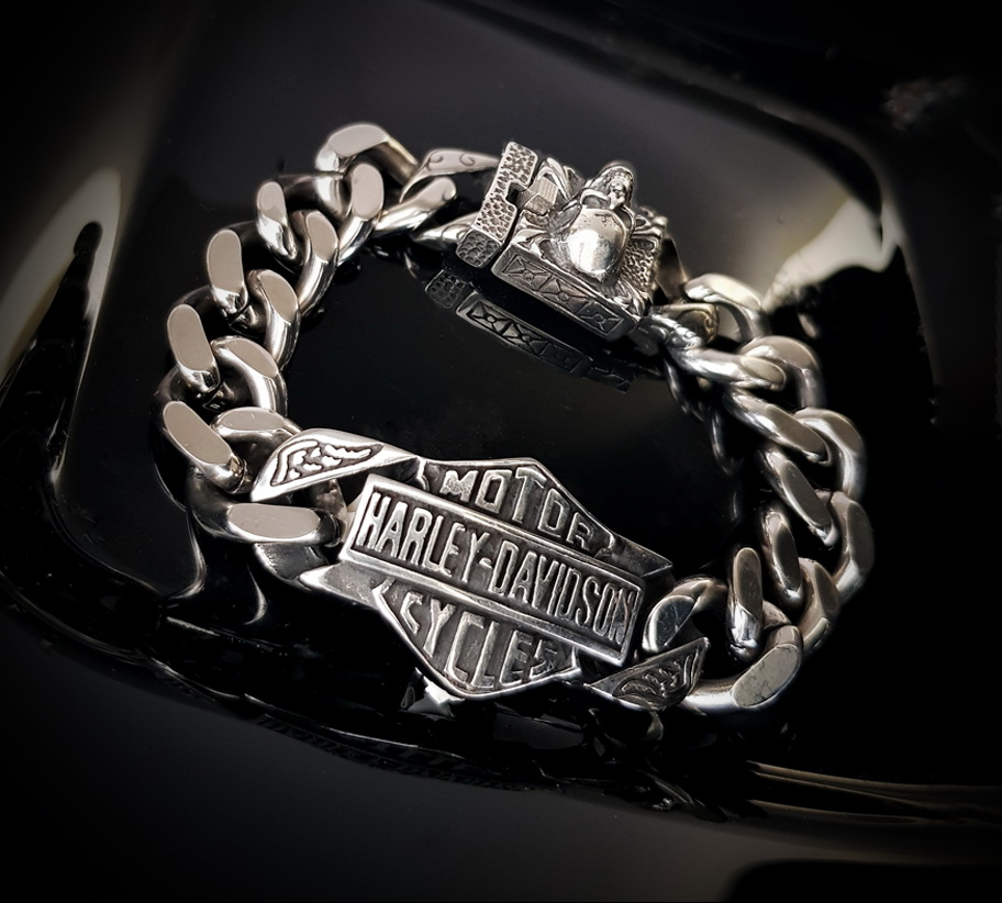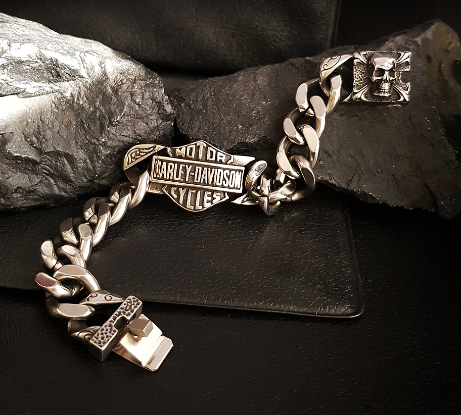 Nemesfém , sterling ezüst karkötő. A karkötő elején Harley Davidson motívum van. , kiváló minőségü , szépen megmunkált darab.A vége tolókapcsos biztonsági záras , koponyafej vésettel.