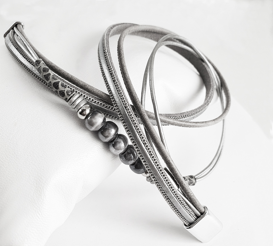 A szürke többzsinóros karkötő közepén szépen kiemelkednek a fényes kerámia gyöngyök. A gyöngyök két szélét vele szinben harmonizáló egzotikus bőrgyöngy díszíti.