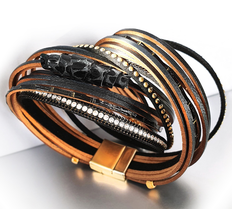A karkötő10 szálas bőrzsinórból áll. Fekete lakkbőr díszítést kapott,mely kiemeli a karkötő eleganciáját. A fekete többzsinóros karkötő közepén szépen kiemelkedik a fekete lakkbőr gyöngy. A karkötőt kétszer kell áttekerni a csuklón. A karkötő vége mágneszárral csatolódik.