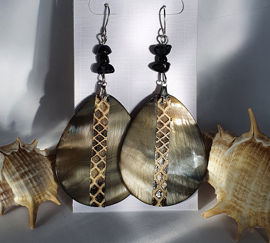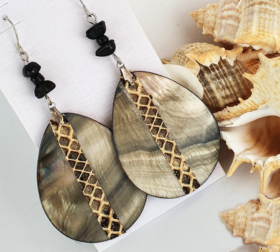 A hosszában futó bőr , majd a felette lévő fekete ásvány kellemes színösszhangot ad a fülbevalónak. Egyszerü, mutatós darab.