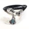 A skullfejes zsinór kerek rugós kapcsot fog közre, melyen található a kékeszöld szem medál.