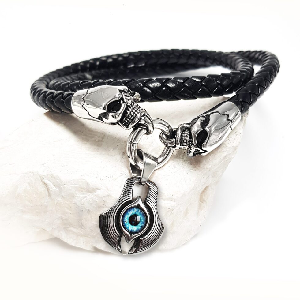 Kék sárkányszem skullfejes férfi bőr nyaklánc