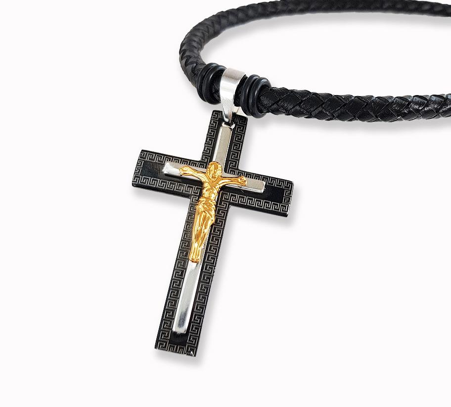 Fekete 4mm-es fonott bőr zsinóron lévő kereszt.