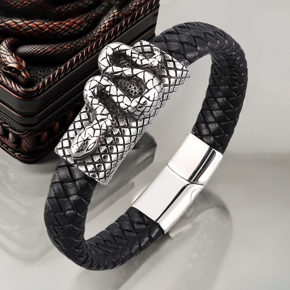 A kígyós bőr férfi karkötő a megújulást, az átalakulást, a bölcsességet és az erőtit jelképezi, emellett pedig viselője stabilitását és erejét is kifejezheti.