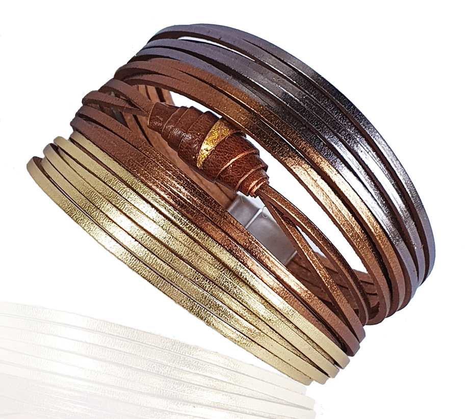 A 3 szín árnyalatában pompázó többszálas bőr karkötő közepét színben harmonizáló festett bőrgyöngy díszíti, és egy kis csavarás még különlegesebbé teszi.