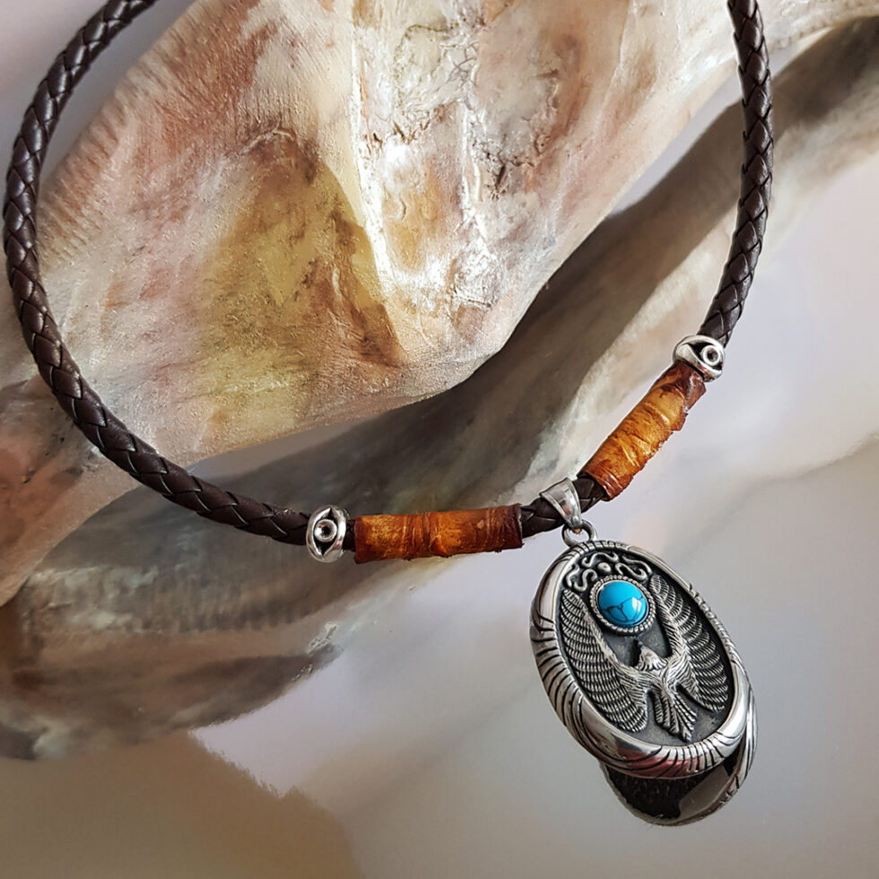 A 925-ös ezüst sasmotívumos nemesacél medált türkiz drágakő díszíti, mely nemesi rangot jelent viselőjének, és az ékszert amulettként, talizmánként viselik.