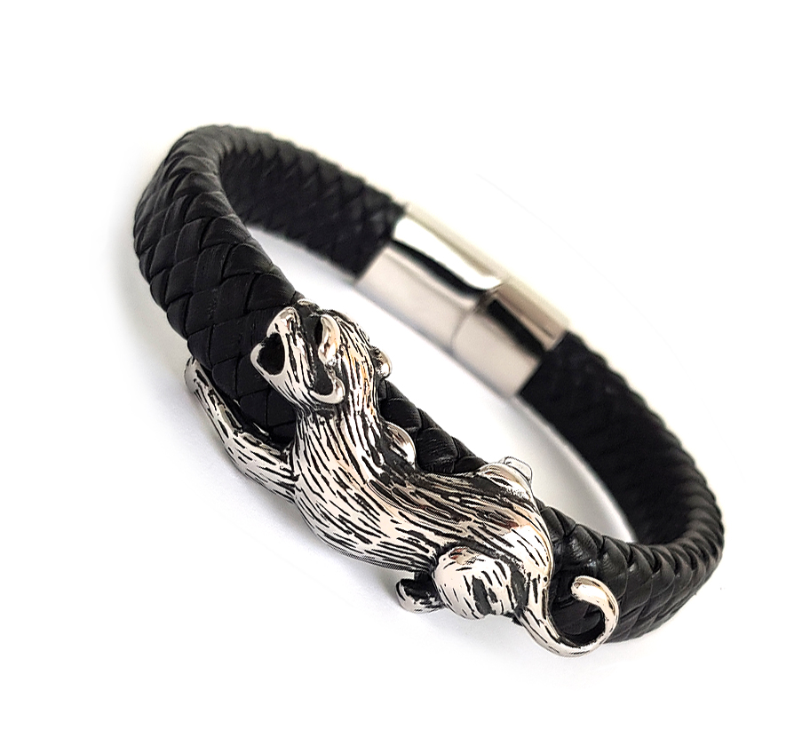 Egyedi és különleges, ez a párduc figurás bőr fekete karkötő.