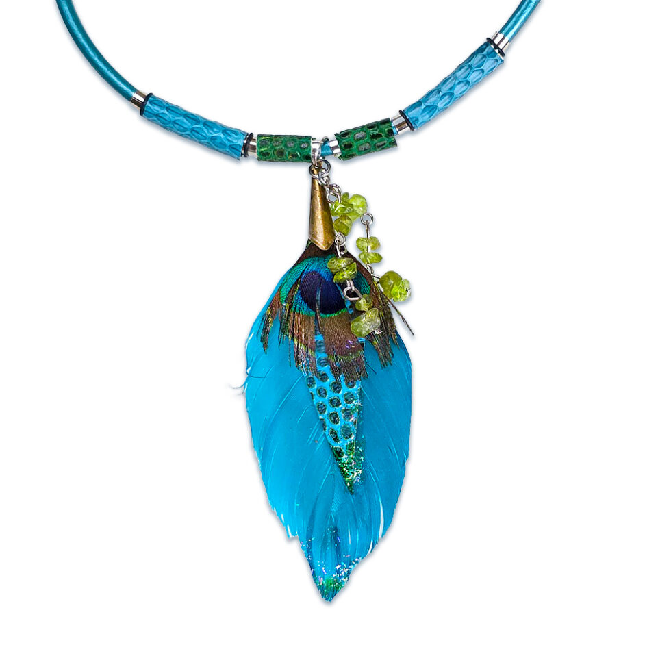 Ez a nyaklánc egy egyedi feltűnő, egzotikus stílusú ékszer, amely a türkizkék toll és a pávatoll eleganciáját ötvözi.