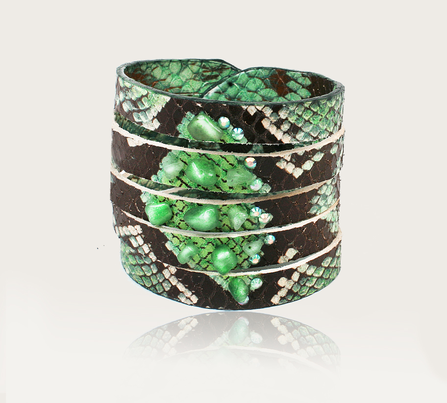 A karkötő érdekessége az öt soros bevágás, melyeken zöld ásvány és apró swarovski kristály díszeleg.