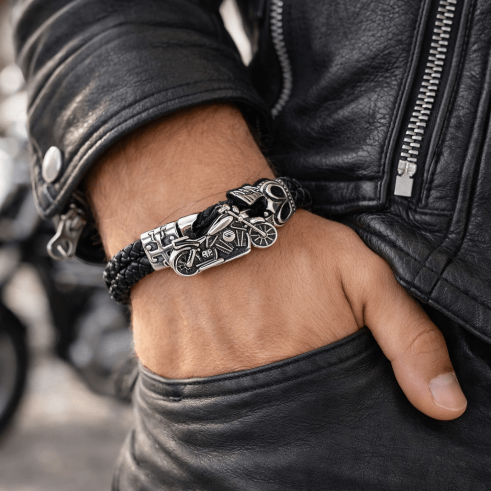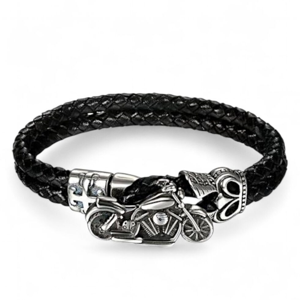 Részletgazdag,krómozott nemesacél felső része egyben a záródást is biztosítja. Masszív fonott bőrszíj tökéletes választás azoknak, akiknek a motorozás nem csak hobbi,hanem életforma.