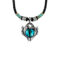 A bőrzsinóron a medál mellett kétoldalt ezüstszínű gyűrűk és festett türkiz bőrgyöngyök sorakoznak.