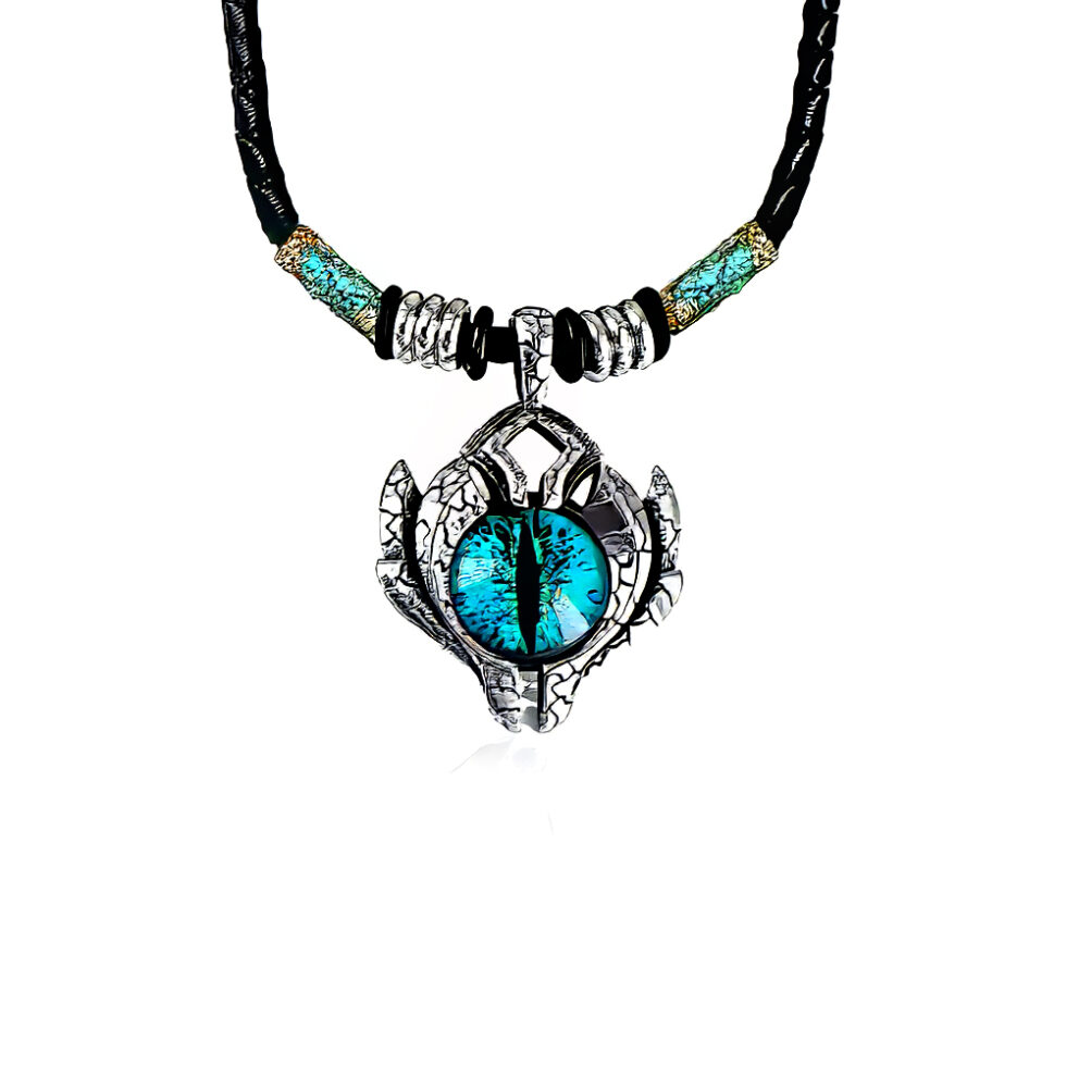 A központi elem egy intenzív, türkizkék sárkányszem medál, melyet egy részletgazdag, nemesacél foglalat vesz körül.