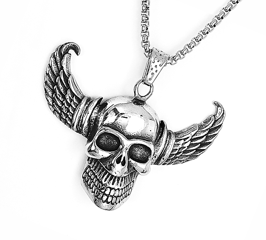 Nemesacél láncon Skull koponyás szárnyas medál. Motorosoknak, rock kedvelőlnek kiváló, robuszt ékszer.