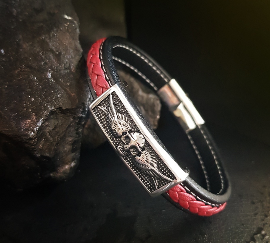 Prémium minőségü fekete 1 , 2 cm-es bór zsinőr sötétpiros csavart rátéttel a szélén fehér tűzéssel. A karkötő elegáns , de egyben sportos darab is! Elejét motoros halálfejes szárnyas nemesacél sterling ezüst skullfigura díszíti. Mérete:4×1 cm