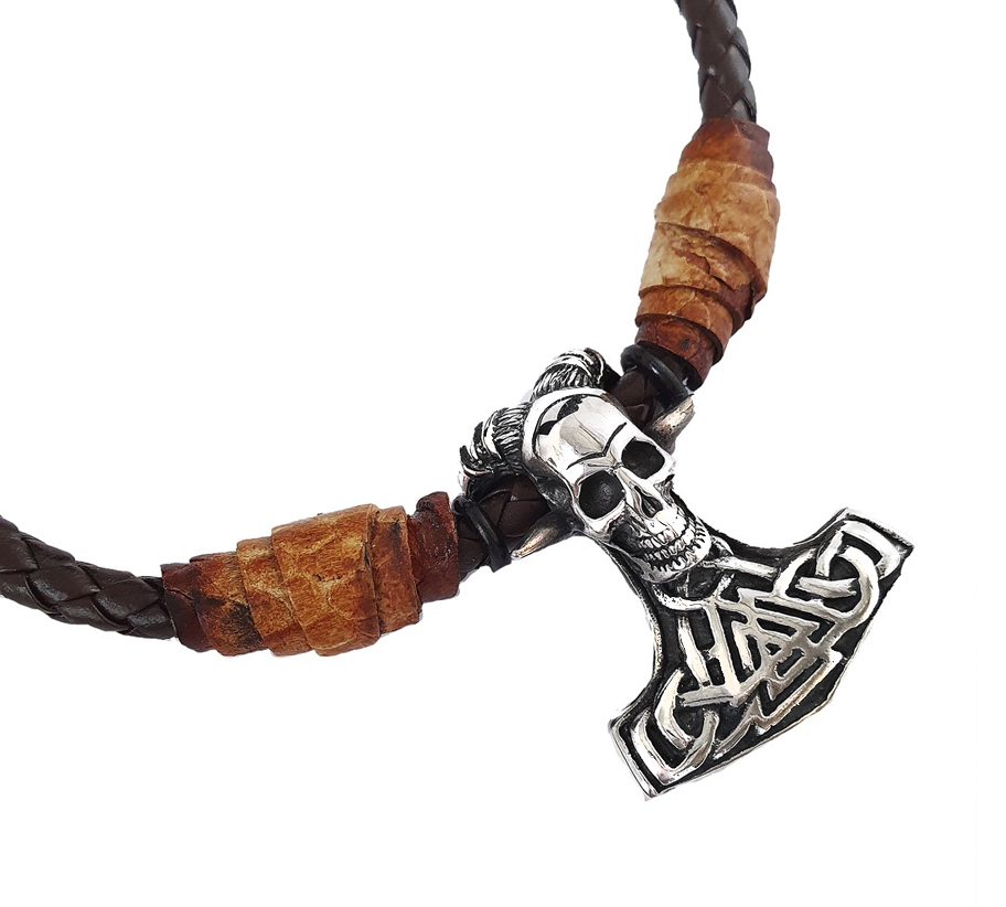 A 4mm-es hengerelt barna bőr zsinóron marhabőr díszítés van. A zsinór vége nemesacél delfinkapoccsal záródik.