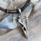 A 4mm-es hengerelt barna bőr zsinóron nemesacél fémköztes és marhabőr díszítés van. A zsinór delfinkapoccsal záródik. Zsinór mérete 50 cm Medál mérete 4×25 cm