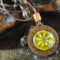 A nyaklánc kaboson lencsével ellátott fa medálja 2,5 cm átmérőjü. A barna viaszolt zsinór alján bőr díszítés van. Csúszócsomós, állítható hosszúságú.