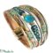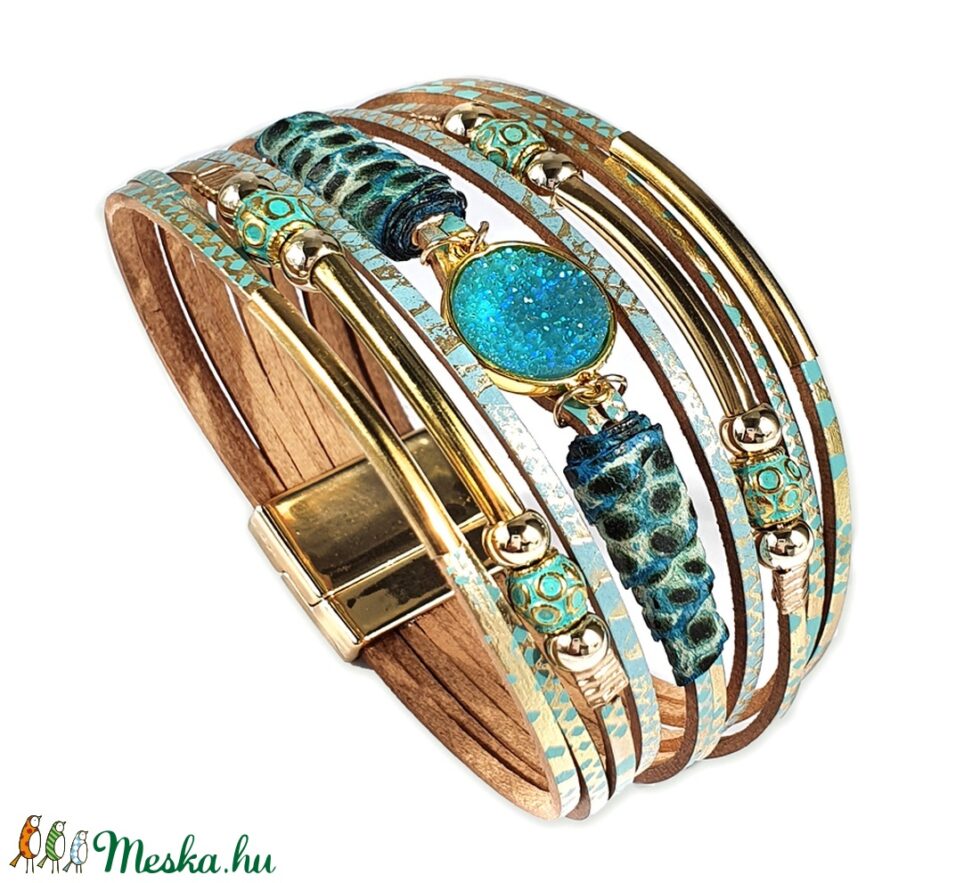 Elegáns, dekoratív darab! A karkötő 10 sávos türkizkék zsinór egyveleggel pompázik. Az apró türkiz és arany fémgyöngyök , az arany színü fémköztesek ,valamint a türkizmintás bőr szálak kellemes színösszhangot teremtenek. A karkötő közepén lévő csillogó türkiz berakást kétoldalt festett rájamintás bőr teszi még különlegessé,kiemelve a karkötő eleganciáját. A karkötő vége arany színü mágneszárral csatolódik. Karkötő mérete: 3×19,5 cm. A karkötőt ajándék dísztasakban szállítom!