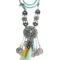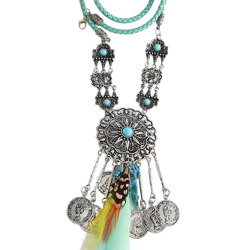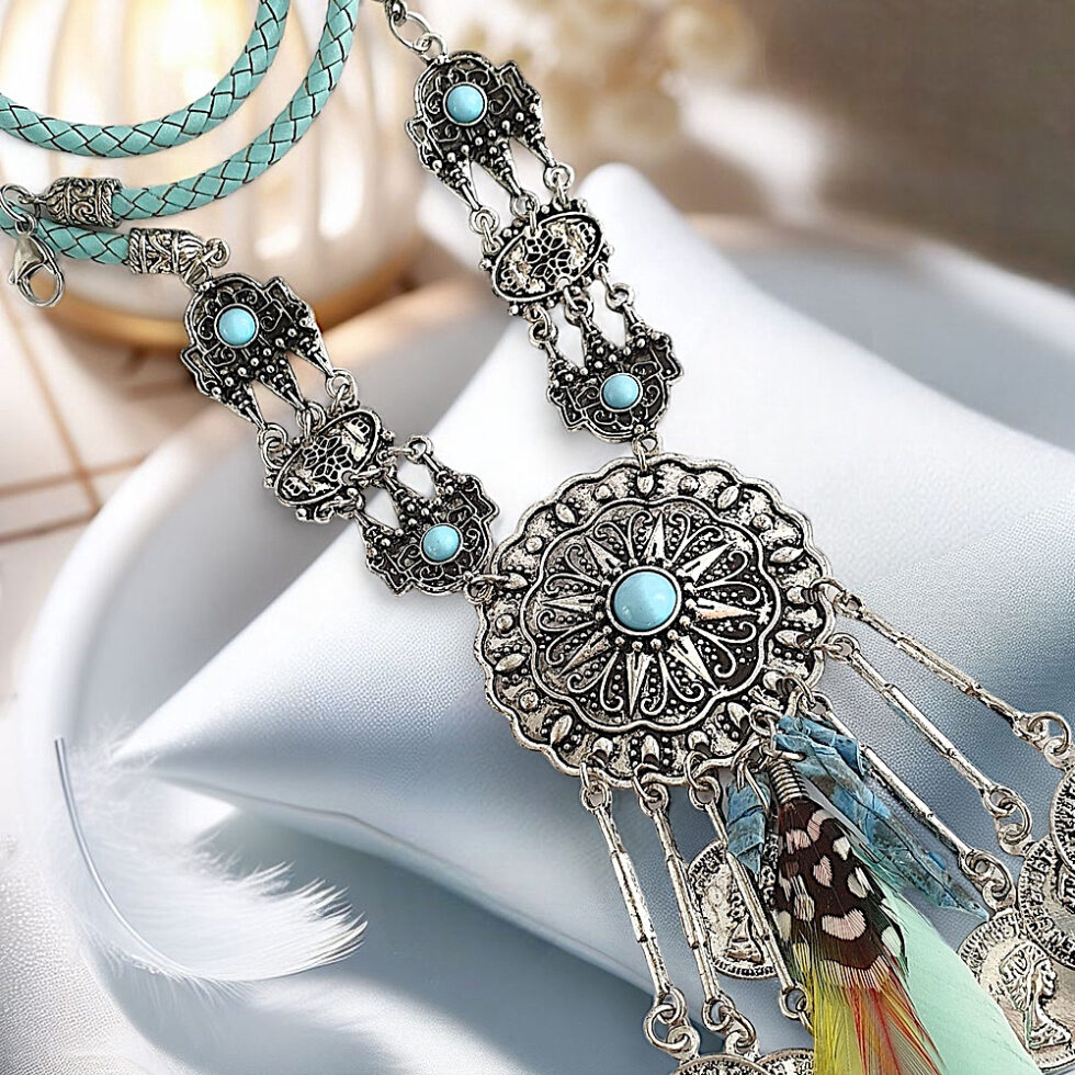 Indián fémötvözet nyakék, türkiz kővel a közepén. A nyaklánc egy 5mm-es fonott türkizzöld zsinóron van, mely delfin kapoccsal záródik. A nyakék alján több aprócska érmék díszelegnek, valamint egy színes toll, mely leakasztható a láncról.