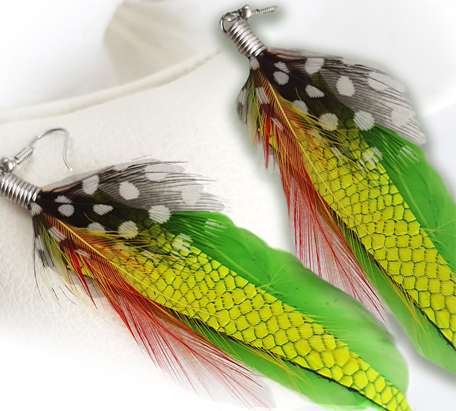 Különböző színű tollak keveréke. pisztácia színű bőr és gyöngytoll diszitéssel. Antiallergén fém , fülbeakasztós.